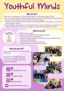 Youthful Minds was the first service which was set up within the CYP team at Mind Jersey in 2015, and has been running ever since. Youthful Minds is a voluntary participation group in which the young people aim to educate others about Mental Health, tackle and reduce stigma surrounding Mental Health and Mental illness, and aims to improve services for Children and Young People in Jersey through sharing the voice of their lived experience. The group meet on a weekly basis and are actively involved in raising awareness and improving services outside of their weekly meetings too. Youthful Minds promotes self-confidence and self-esteem and allows young people to make a meaningful difference within an area they are passionate about. The group work closely with other professionals who support CYP Mental Health and share lots of their fantastic work on their own social media channels. If you are interested to know more about what they do, please do have a look on Youthful Minds Facebook, Instagram and Twitter. If anyone is interested in joining the group then an email can be sent directly to youthfulminds@mindjersey.org